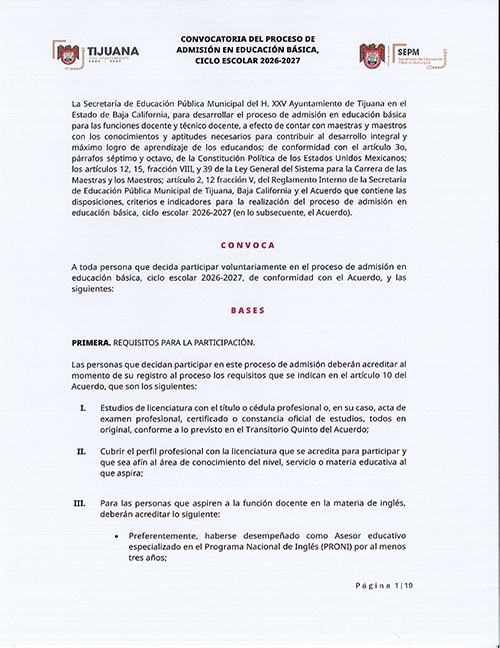 Convocatoria para el Proceso de Admisión en Educación Básica, Ciclo Escolar 2026-2027