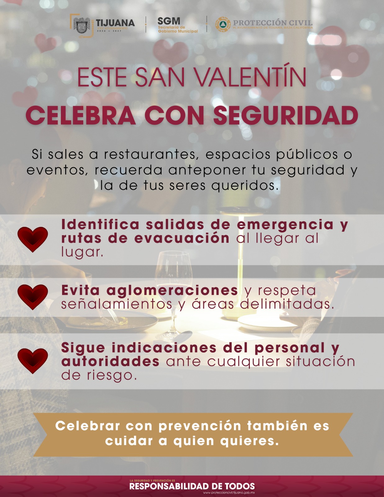 La Dirección Municipal de Protección Civil emite una serie de recomendaciones para celebrar el Día de San Valentín de manera segura, tanto en casa como en espacios públicos, con el objetivo de prevenir incidentes y proteger la integridad de las y los tijuanenses.