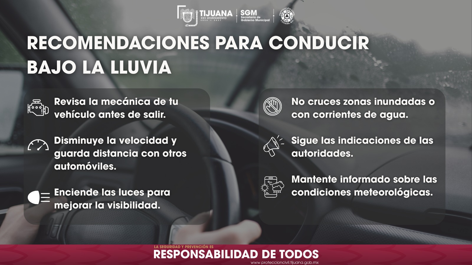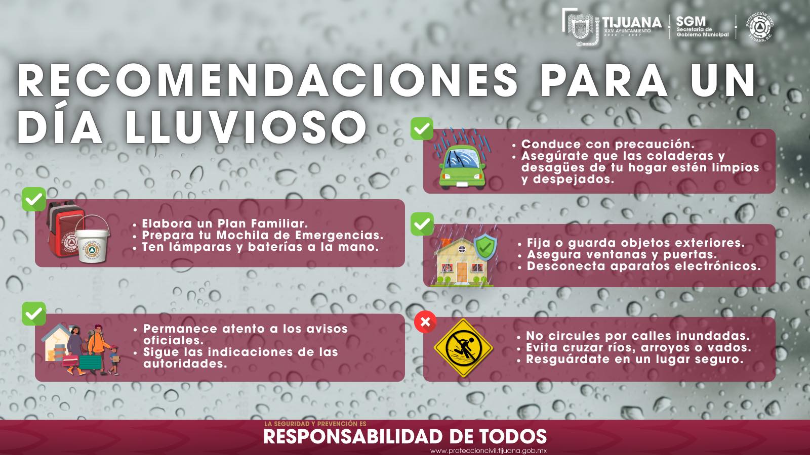El XXV Ayuntamiento de Tijuana, a través de la Dirección de Protección Civil, hace un llamado a la población a reforzar las medidas de prevención ante las condiciones meteorológicas que se presentan estos días en la región, como parte de las acciones impulsadas por el presidente municipal, Ismael Burgueño Ruiz, para garantizar la seguridad de las familias tijuanenses.