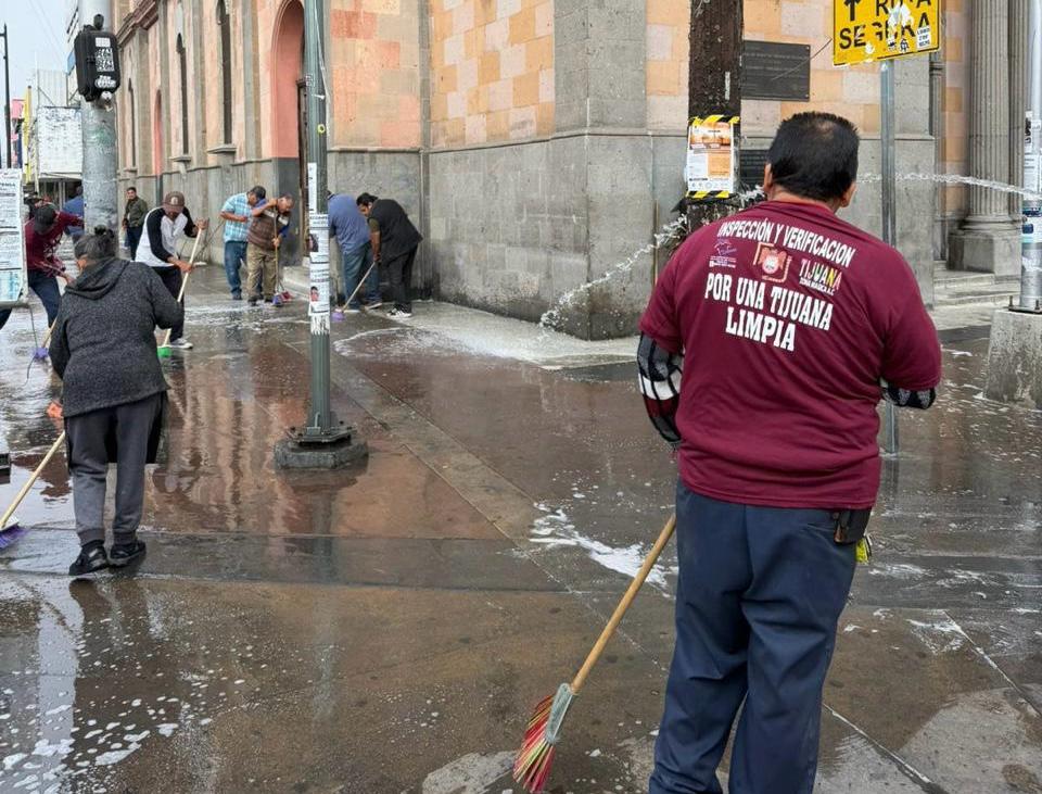 Tijuana, Baja California, a 25 de marzo de 2026. El gobierno del presidente municipal, Ismael Burgueño Ruiz, a través de la Dirección de Inspección y Verificación, llevó a cabo una jornada de limpieza en el primer cuadro de la ciudad, en coordinación con comerciantes de la Asociación Tijuana Zona Centro, con el objetivo de mejorar la imagen urbana y el orden en el municipio.
