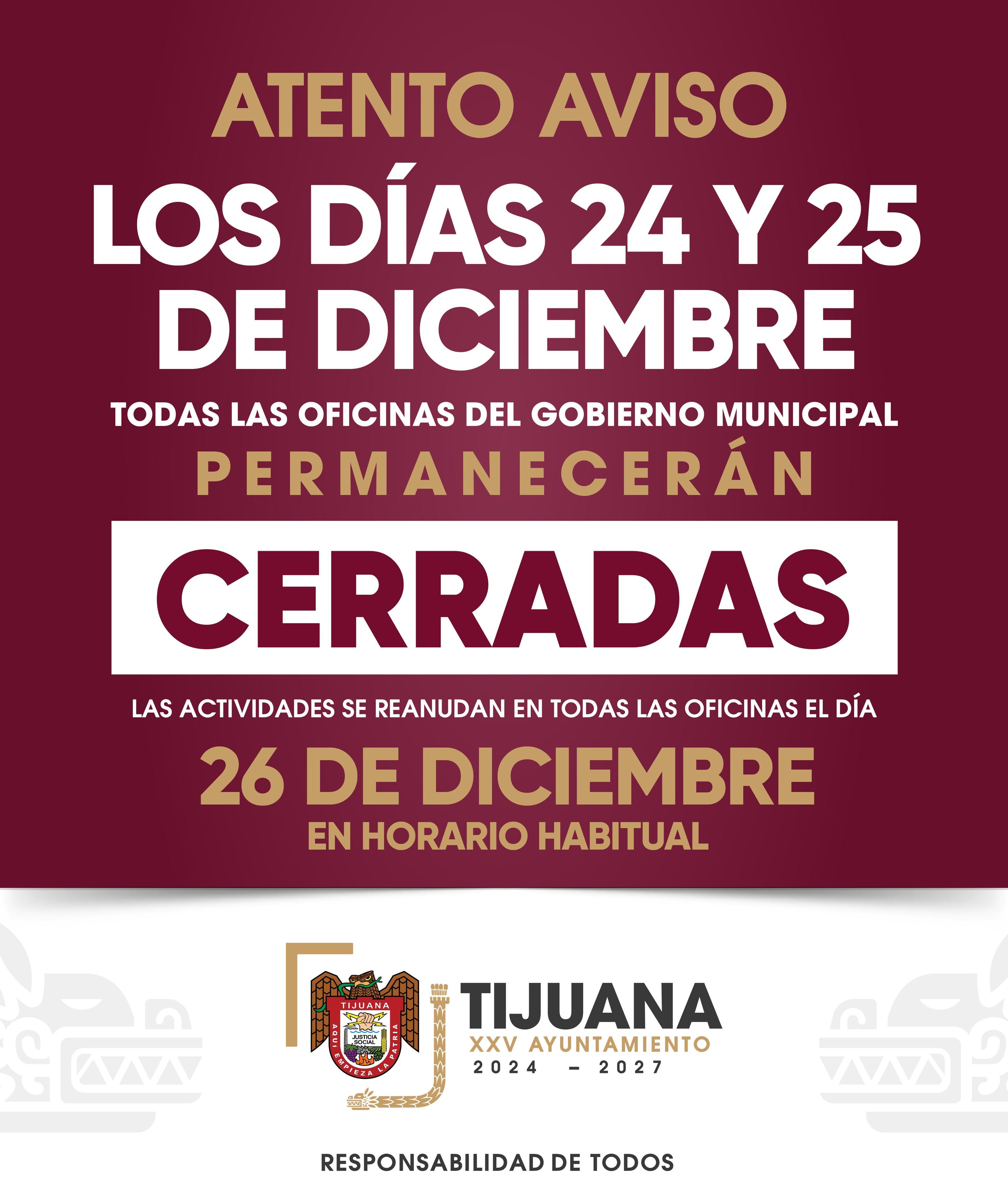 20/12/2025 Tijuana, Baja California, a 20 de diciembre de 2025. El XXV Ayuntamiento de Tijuana, informa a la ciudadanía que debido al periodo vacaciona
